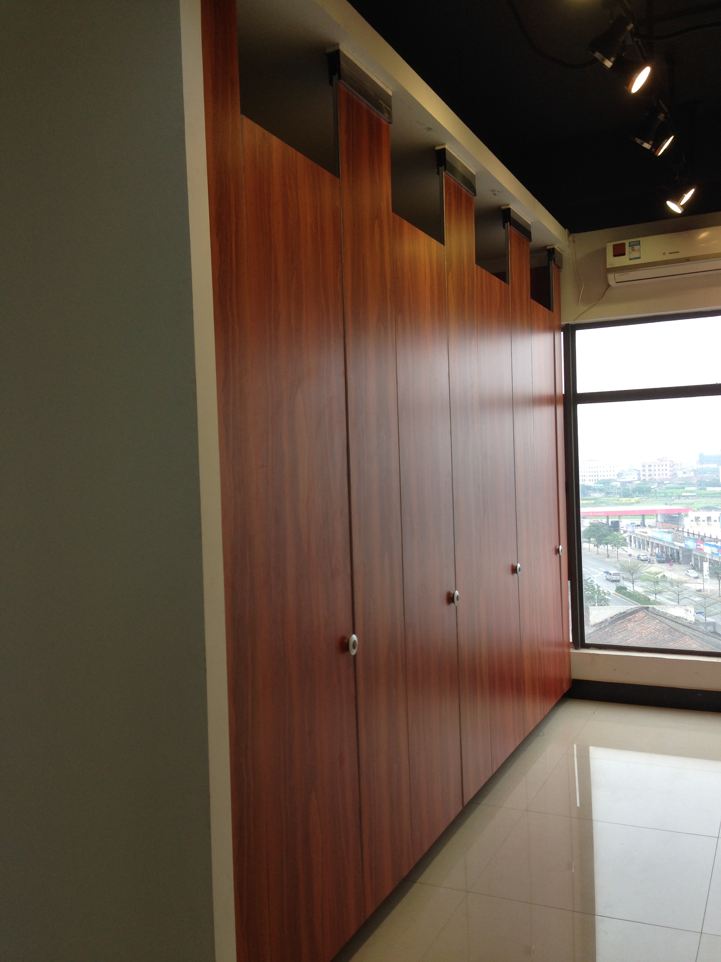 相比于前面的公共場所,寫字樓和酒店衛(wèi)生間隔斷的選擇就比較單調(diào)。絕大多數(shù)該類型場所的公共衛(wèi)生間隔斷,會采用深一些的木紋色或是黑色作為隔斷顏色,給人一種典雅、深沉的感覺。